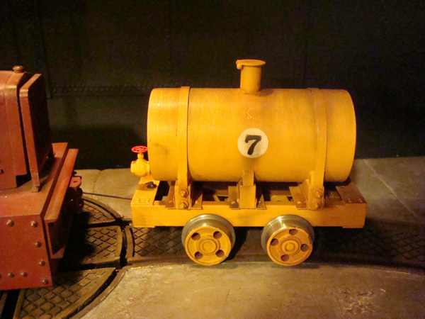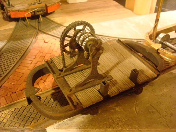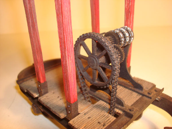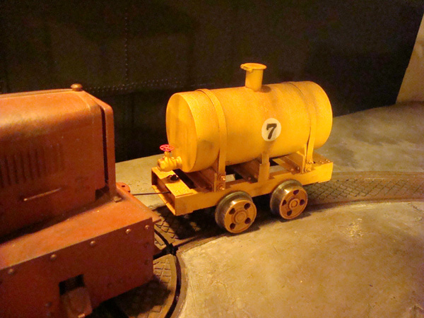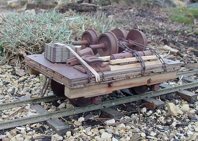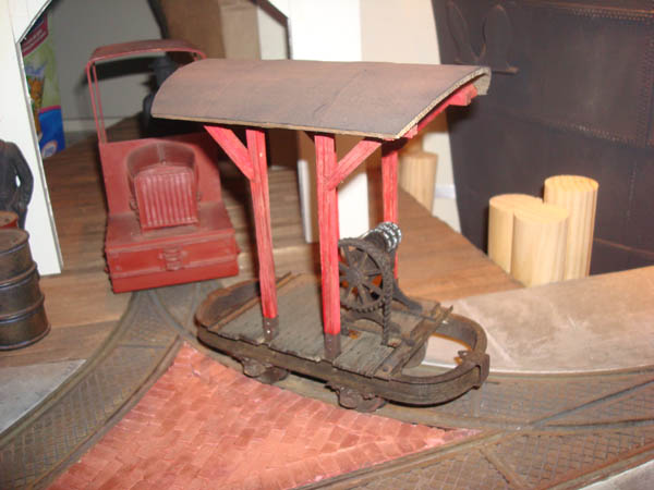 My winter 2006-07 swap car is not based on any known prototype and I have enjoyed letting my imagination run free. Keeping with tradition there are two cars - one to keep and one to send. The wheels and many of the fittings are from Sierra Valley. I used Sierra Valley parts for the journal bearings and lids but made my on masters for the rest of the journals. The riders are modified figures made by Carlo Spirito. Their glasses were soldered up out of brass. To keep them seated on the bench I placed strong magnets in their bases and embedded a small amount of iron under the bench seat. They are supposed to look like Teddy Roosevelt - if you squint and turn the lights down you can almost believe it. The packing crates hold fossils that Mr. Roosevelt found during his inspection tour of the line. |