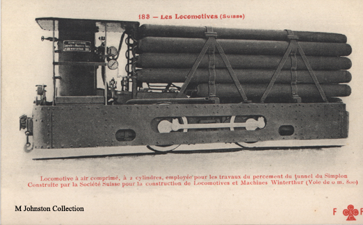 Swiss air locomotive used in the construction of the Simplon tunnel. For additional details see Compressed Air Magazine, July 1902, Vol VII, No 6, pp1906-1908 |