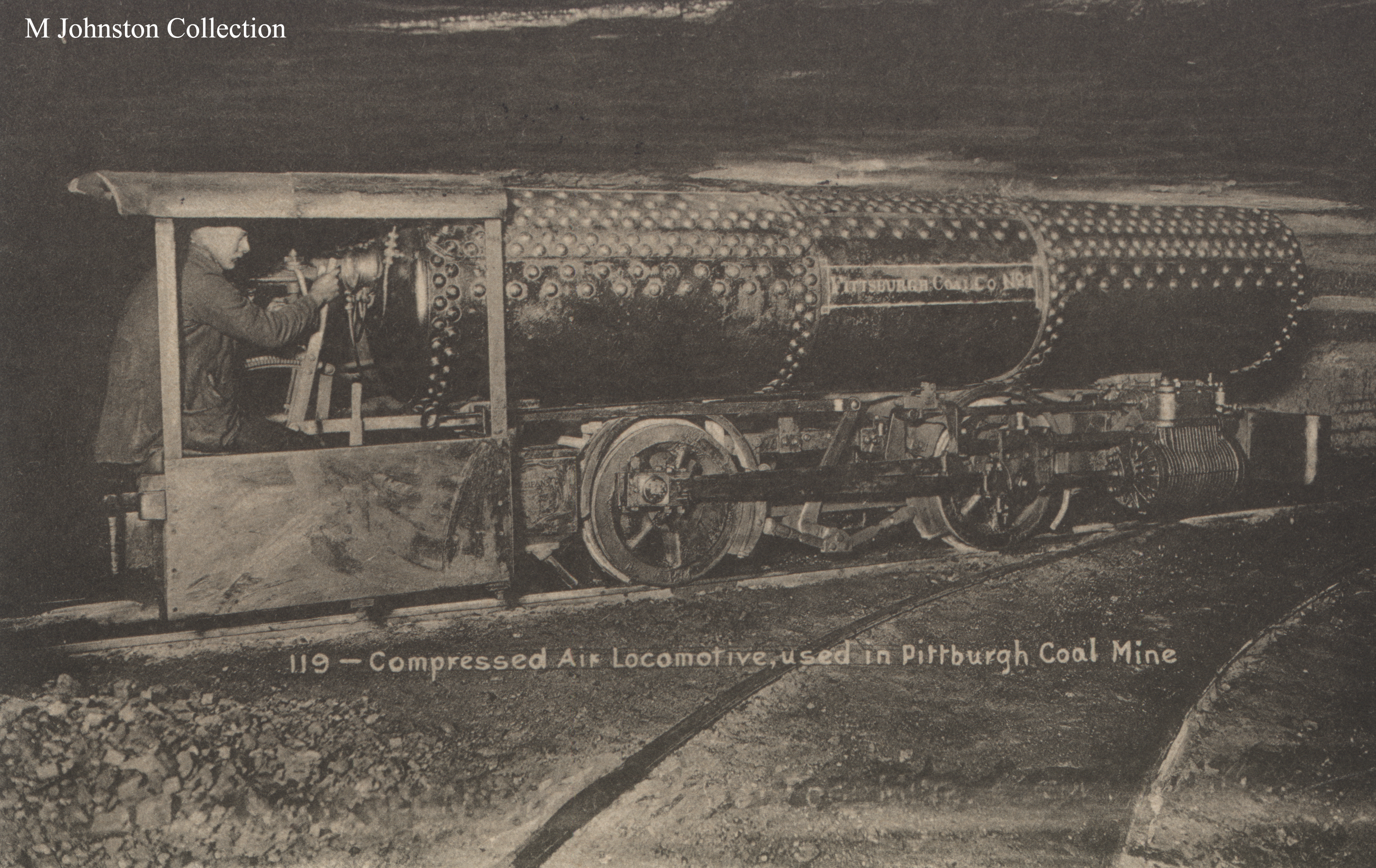 Empire mine had several small compressed air locomotives, built by Edward A Rix. Overall Dimensions: 5’ long x 30” wide x 52” tall Gauge: 18”, Locomotive Tank: 36” dia, 48” long, Pressure: 500 lbs Locomotive driven by a pair of vertical engines and a chain and sprocket drive connecting the craft shaft with the rear axle. For additional details see Compressed Air Plant For Mines by Robert Peele, 1st ed. 1908, pp306-308 |